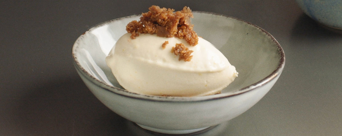 - Medan glassmassan fortfarande är varm, tillsätt det brynta smöret och frys till glass i maskin eller på annat sätt.