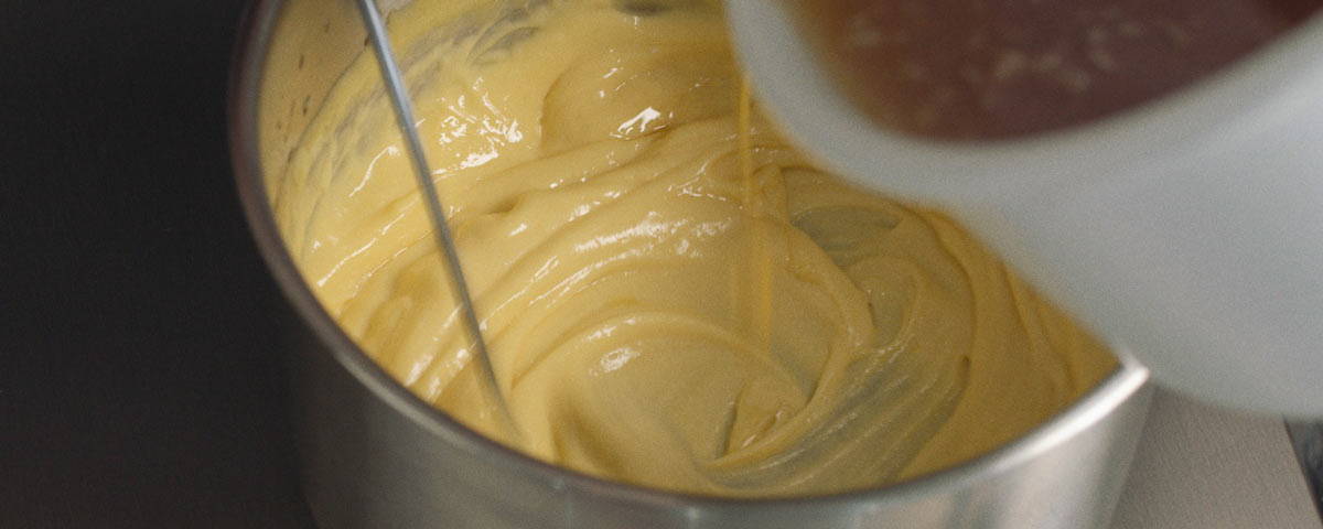 Ta kastrullen från värmen och tillsätt det brynta smöret i en tunn stråle under ständig vispning.
