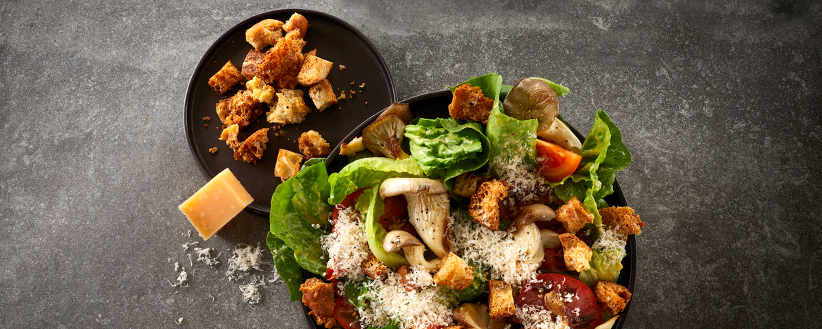 En caféklassiker med dressing gjord på klassiskt sätt med ansjovis, men med Havgus 24 istället för parmesan. Här har vi bytt ut kycklingen mot svamp, vilka ger rätten kontrast och konsistens medan Havgus 24 tillför fyllighet och smak. Vill man ha en helt vegetarisk variant kan ansjovisen utelämnas.