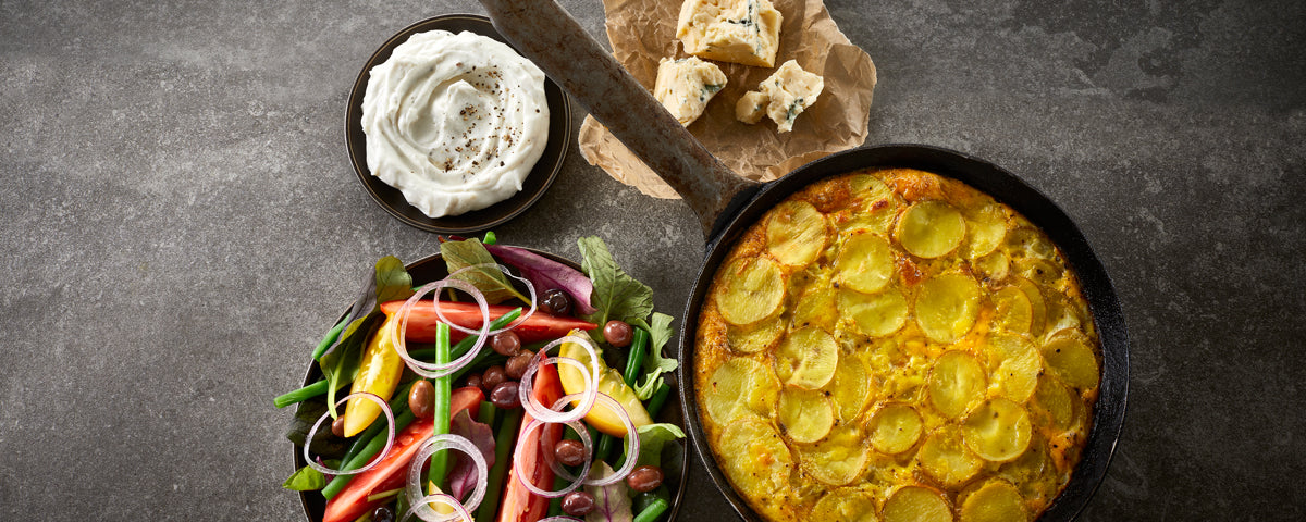 Fritatta består av potatisskivor som läggs i en panna med äggmassa och bakas i ugnen. I den här varianten serverar vi frittatan med en dressing gjord på Høgelundgaard 12. Genom att blanda osten med grekisk yoghurt får du fortfarande ostsmak, men i en mindre intensiv variant. Dressingen tillför umami till rätten.
