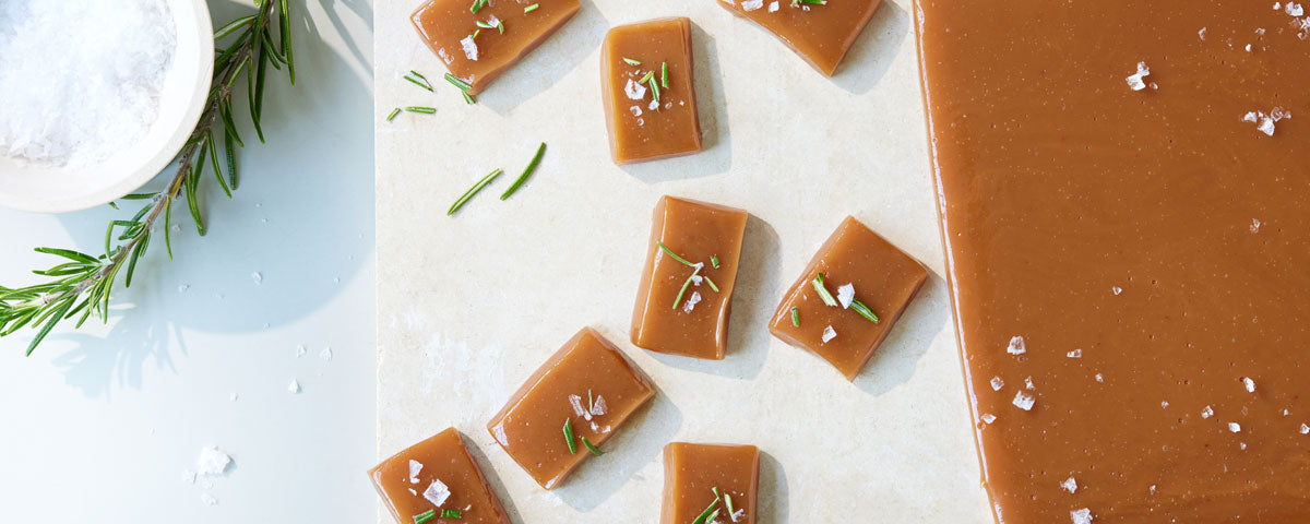 8. Häll den kokta karamellblandningen i formen och låt den svalna i rumstemperatur i 30 minuter. Strö över hackad rosmarin och flingsalt och skär karamellen i lagom stora bitar. Förvara karamellen i en lufttät behållare i kylen fram till servering.
