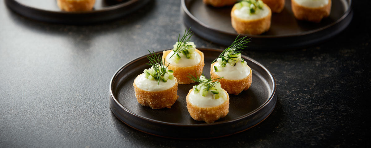 Spröda krustader med vispad Loke och gurkfyllning. Gör det enkelt för dig och köp krustaderna, eller använd receptet här och gör dem själv.