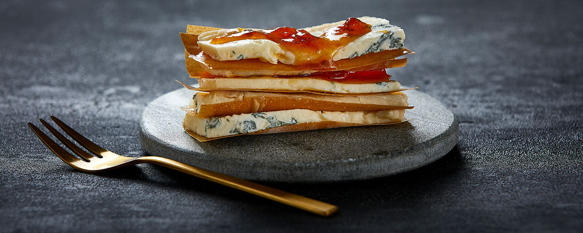 En ostdessert med tunna lager av krispig filodeg och krämig, mild blåmögelost. Alla olika delar kan enkelt förberedas i förväg så att rätten bara behöver monteras innan servering.