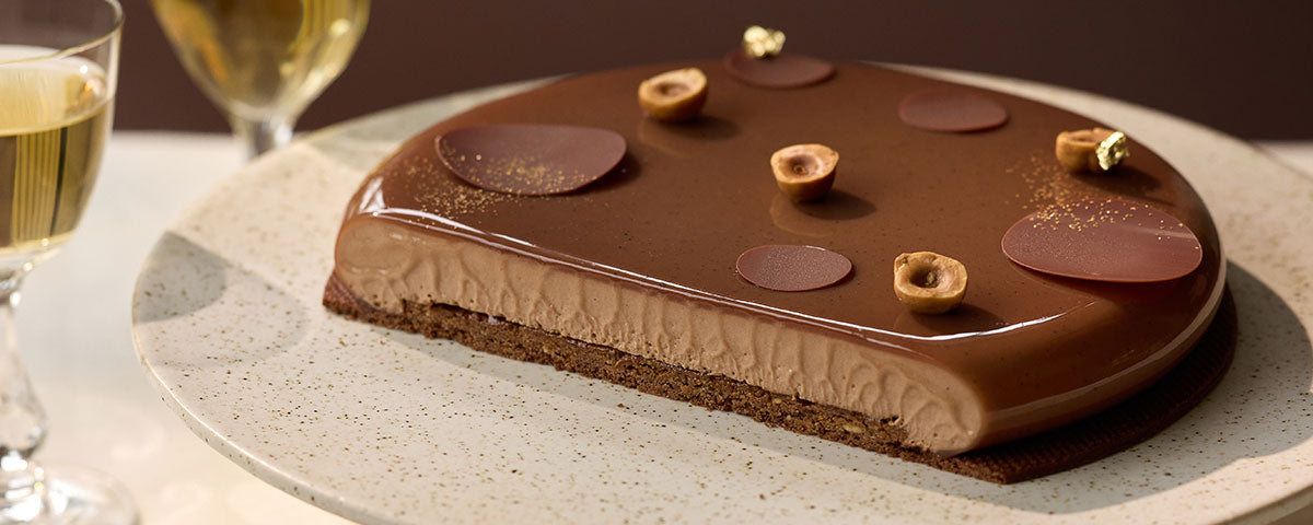 - Dekorera tårtan med chokladcirklar av tempererad mjölkchoklad, halverade hasselnötter och ätbart bladguld. Görs bäst strax före servering.