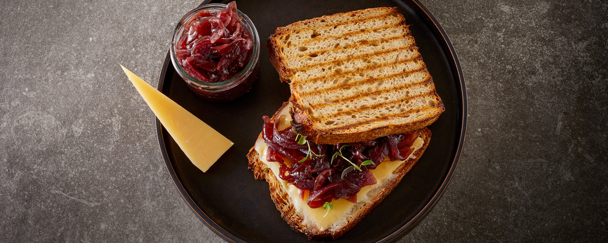 Denna franskinspirerade lökkompott är ett utmärkt bastillbehör I kylskåpet. Den kan användas till allt från kötträtter och sallader till varm osttoast, bara för att nämna några. Passar bra till de flesta ostar bland annat Havgus 12, Gammel Knas, Sølvræv och Rød Løber.
