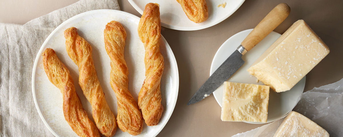 9. Vänd degen ett kvarts varv och rulla den till 1 cm tjocklek (ca 35 x 20 cm). Skär degen i 2 cm tjocka remsor på kortsidan. Pensla över- och undersidan av remsorna med uppvispat ägg, snurra dem runt sig själva och lägg dem på en plåt med bakplåtspapper.