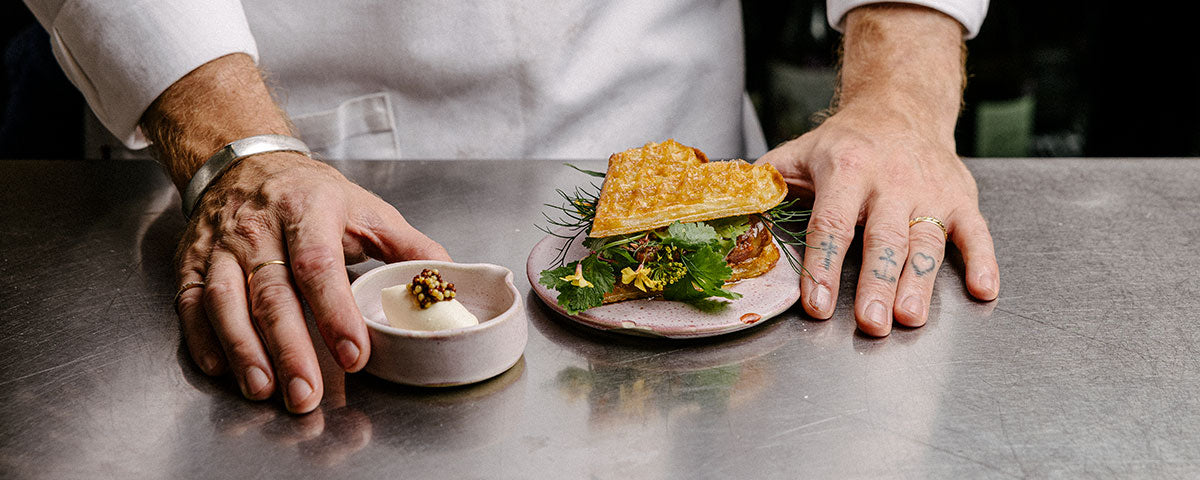 - Toppa rikligt med blandade färska örter, framförallt dill och koriander. Lägg ytterligare ett våffelhjärta överst och pensla det med brynt smör. Avsluta med flingsalt.