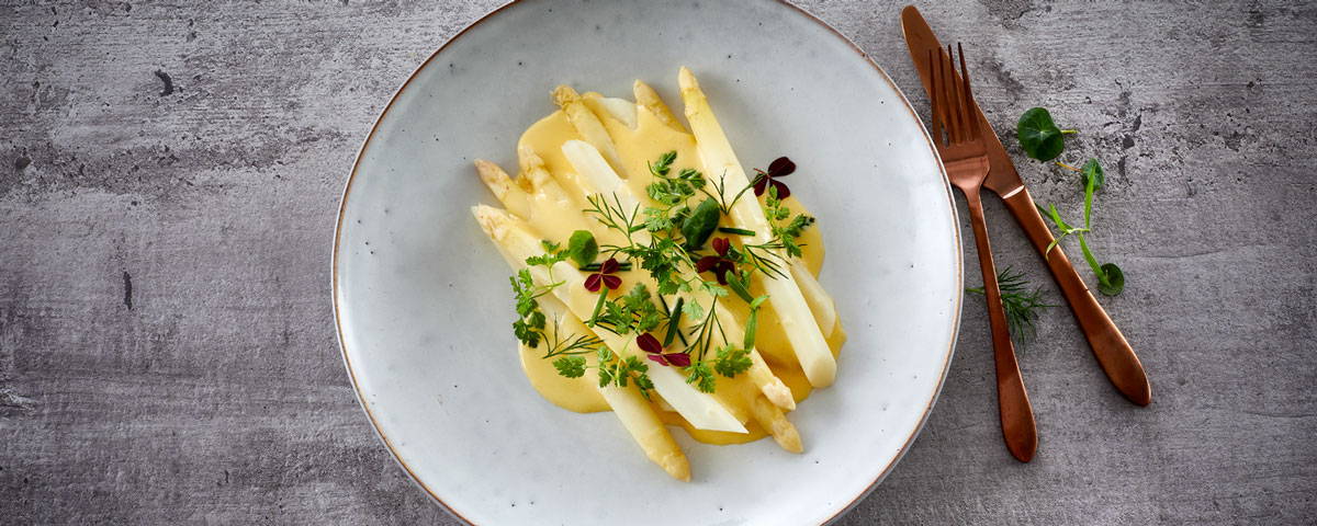 Vit sparris är den ultimata försommarrätten. Serveras här i all sin enkelhet med en klassisk, sammetsmjuk mousselinesås.
